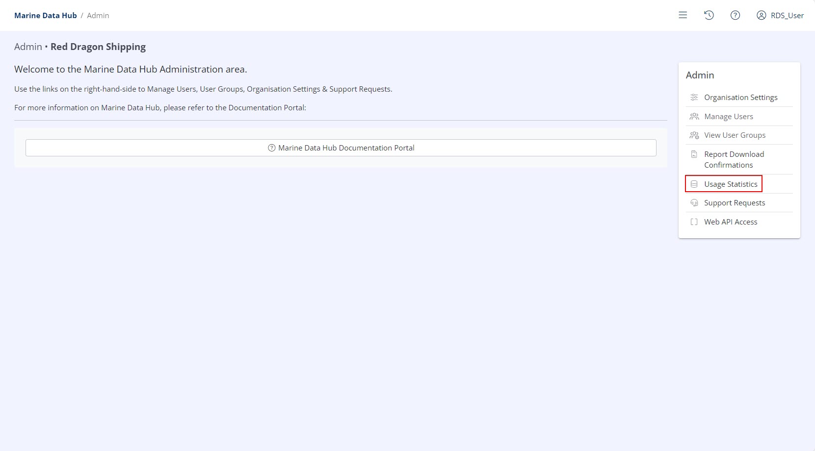 The Usage Statistics section is located in the Administration Menu. For more information on how to access the Administration Menu, refer to Navigate to the Admin Area.