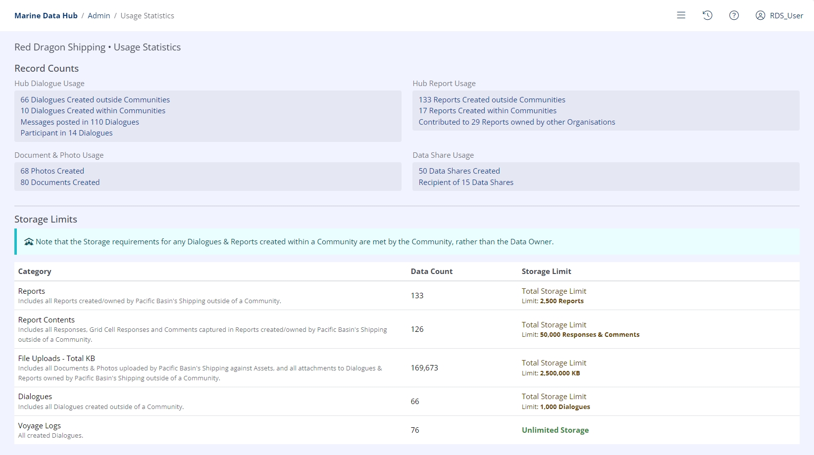The Usage Statistics area has no configurable options, but informs Organisation Administrators of their current Hub usage and any limits they may be approaching.