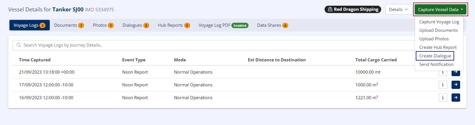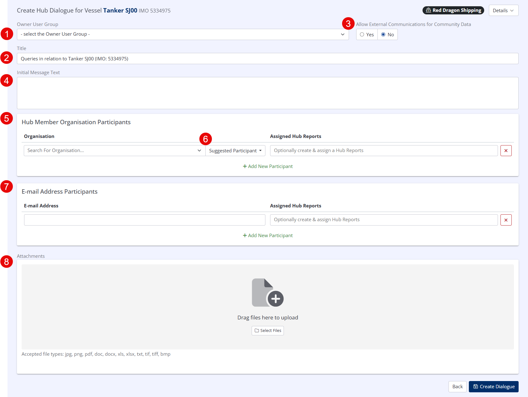 - Based on the subject of the Dialogue, Hub will automatically suggest the most relevant Participant for the Dialogue i.e. for a vessel, Hub will suggest the Ship Operator.