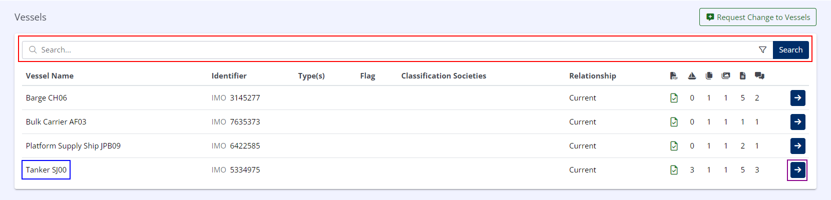 - Using the Search Bar, type the (partial) vessel name and click Search.