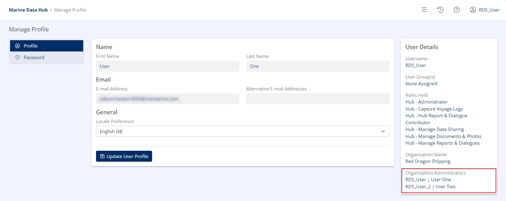 A list of administrators for your organisation can be found in the Organisation Administrators section of your Profile.