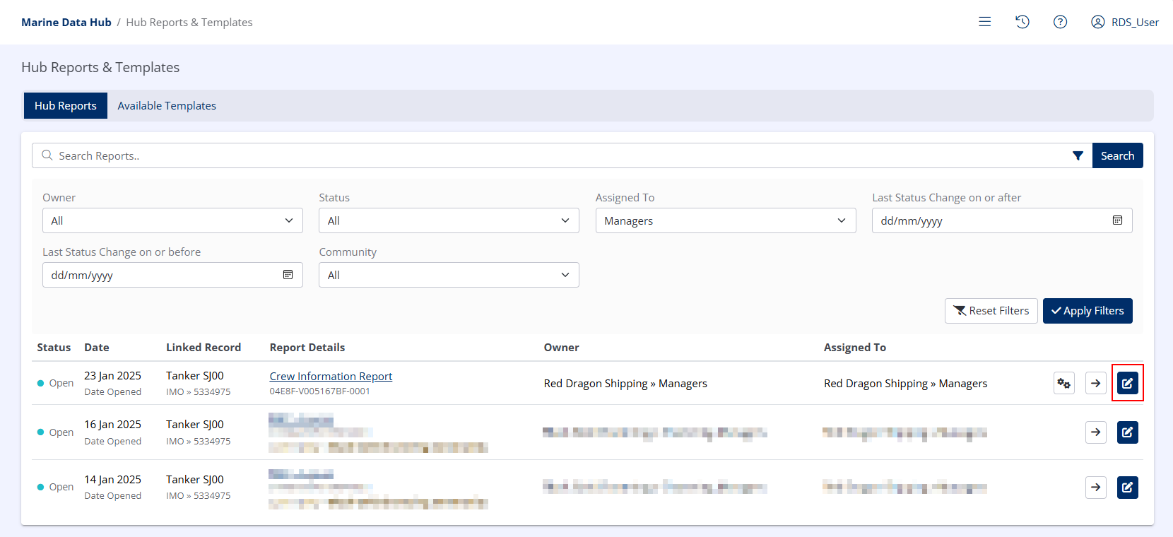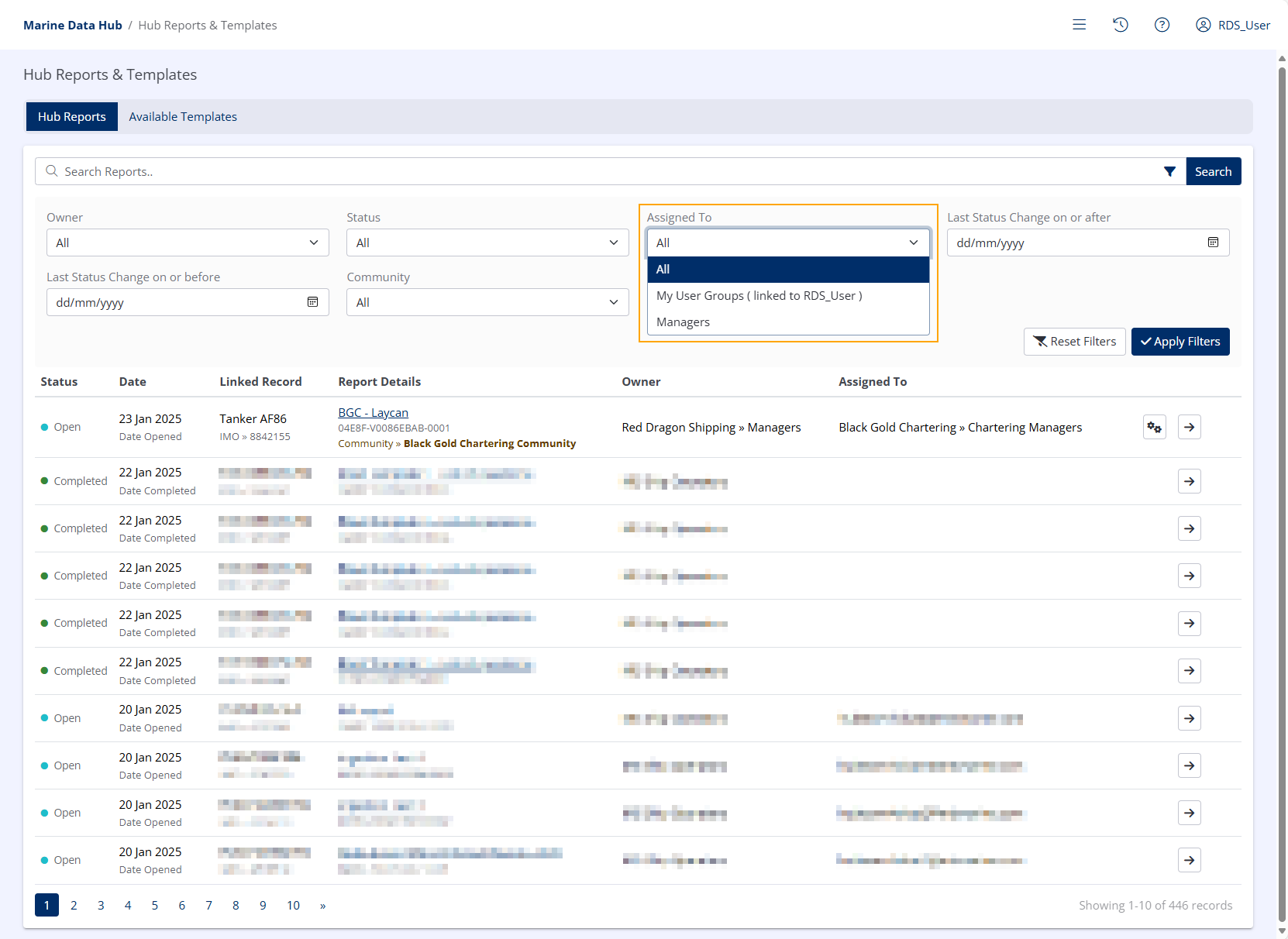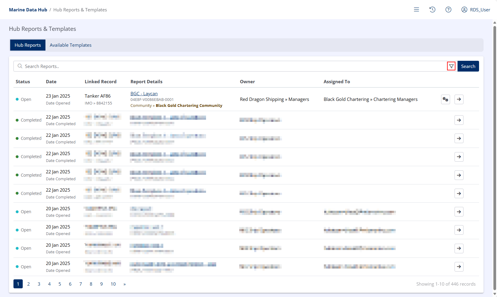 The Hub Reports & Templates page lists all Hub Reports you own, you have assigned to other users, or attached to Hub Dialogues you are participating in.