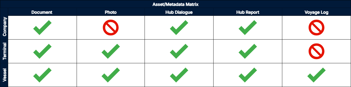 - Data is always linked to an Asset e.g. a Photo of a Vessel will be explictly associated with that Vessel and owned by the organisation that uploaded it into Hub.