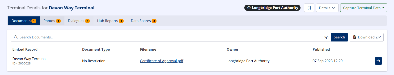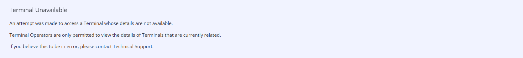 Terminal Operator users will only be able to see the details of a Terminal to which they have a current or historic relationship and any attempt to access other terminals will return an error.