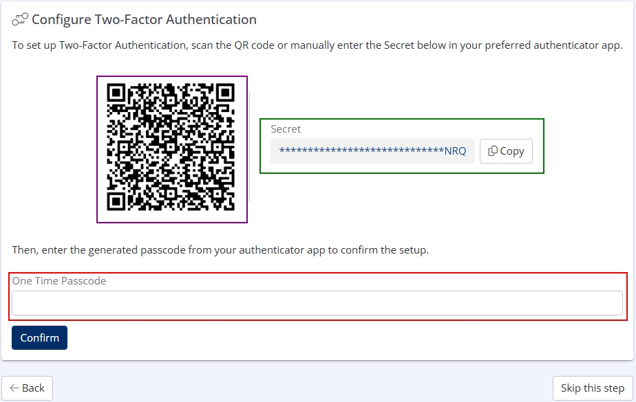 Input the Secret into or scan the QR Code with your chosen authenticator. Enter the provided OTP into the One Time Passcode field and click Confirm.