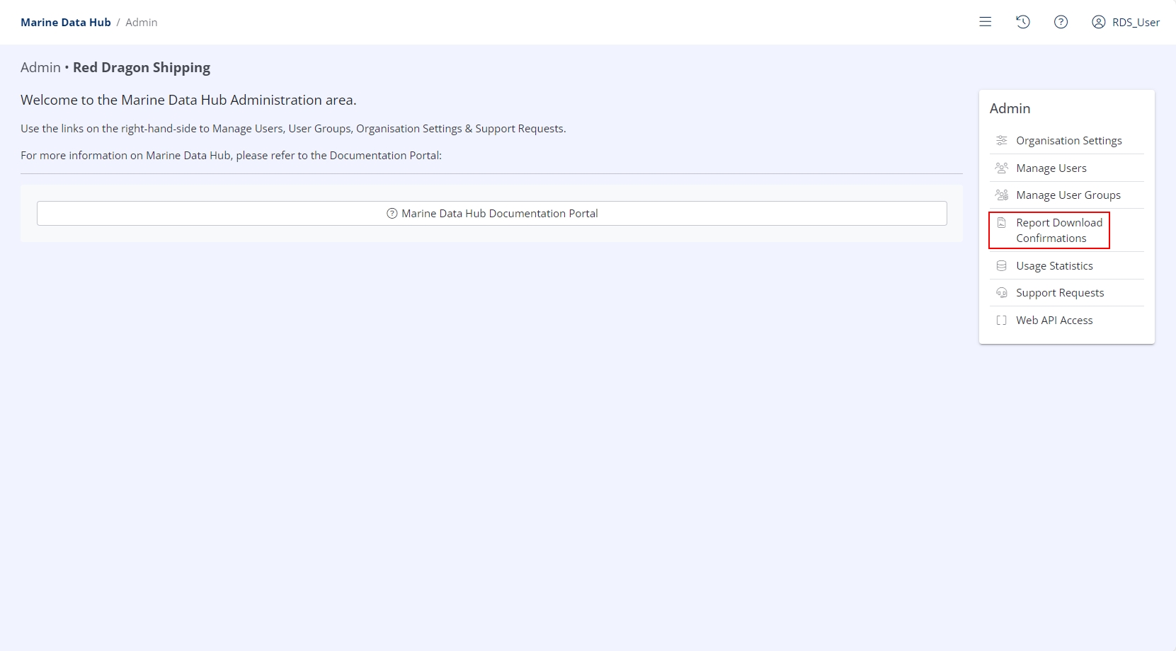 The Report Download Confirmations area has no configurable options, but informs Organisation Administrators of any Hub Reports that require Download Confirmation that have been downloaded.